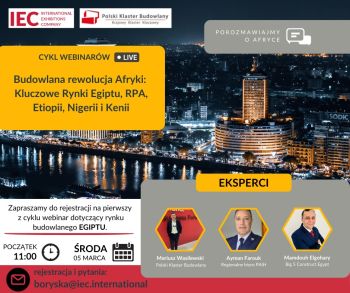 Zapraszamy do rejestracji na webinar: Budowlana rewolucja Afryki: Kluczowe Rynki Egiptu, RPA, Etiopii, Nigerii i Kenii, organizowany przez IEC International Sp. z o.o., przy współpracy z Polskim Klastrem Budowlanym.   Pierwszym z cyklu będzie spotkanie na temat rynku budowlanego Egiptu. O wyzwaniach i zaletach egipskiego rynku budowlanego opowie Pan Mamdouh Elgohary, Dyrektor targów Big5 Egypt. […]